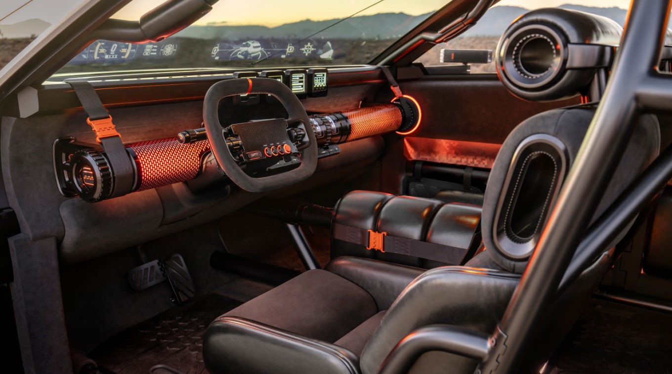 Але найбільший сюрприз — інтер’єр. Перед водієм і пасажиром нема звичайної панелі, замість неї — чорний циліндр із помаранчевими акцентами, підвішений на ременях із пряжками. У стилістиці весь салон відсилає до персонажа “Crater Man” — його можна знайти й на зовнішньому світлі. Усі екрани — окремі знімні модулі, під ними розташована панель з “крутилками” та фізичними кнопками, що виглядає майже олдскульно.