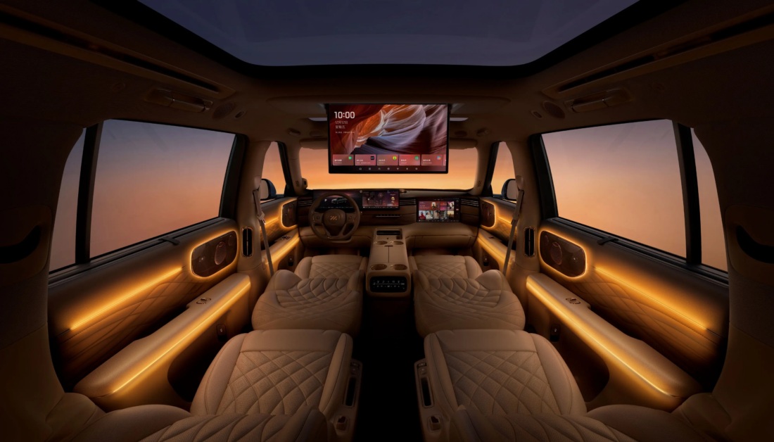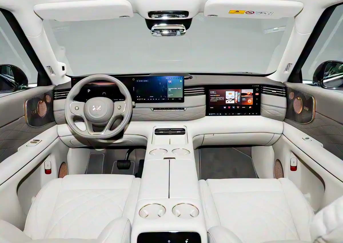 У салоні встановлено два великі дисплеї — 27,1-дюймовий для водія та 15,6-дюймовий для пасажира. Для задніх рядів передбачено телевізор у стелі, а сама компоновка — шестимісна. Кожне крісло має електропривод, підігрів, вентиляцію та масаж. Серед бонусів — холодильник, потужна акустика Bang & Olufsen і система напівавтономного руху.