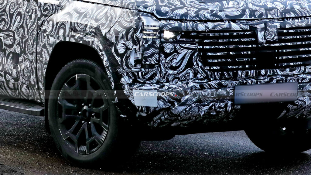 По боках помітні квадратні колісні арки, потужні панелі та нерухомі пороги. Форма бічних вікон дуже нагадує Land Cruiser 250 та Lexus GX з різкими передніми кутами. Ззаду силует залишається “коробчатим”, з антикрилом на даху, вертикальним склом та, ймовірно, двомаєрними дверцятами багажника. Деякі тестові автомобілі вже обладнані зимовою гумою та панорамним люком.