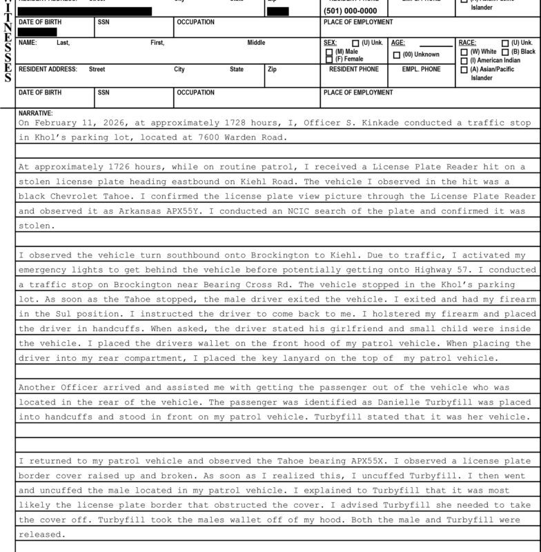 «Я отримав сповіщення від зчитувача номерних знаків про вкрадений номерний знак, що рухається на схід по Kiehl Road. Транспортним засобом, який я побачив у сповіщенні, був чорний Chevrolet Tahoe. Я підтвердив знімок номерного знака через систему та ідентифікував його як Arkansas APX55Y»