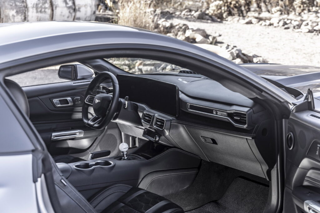 Салон автомобіля також зазнав оновлень, хоча вони мають переважно косметичний характер. До них відносяться вишиті килимки, пороги з логотипом Super Snake, серійна табличка на торпедо, що відповідає номеру на двигуні, а для версій з механічною коробкою — спеціальна куля перемикача передач від Shelby. Ці деталі мають значення для прихильників бренду, оскільки відсилають до його багатої історії. Кожен автомобіль реєструється в офіційному реєстрі Shelby.